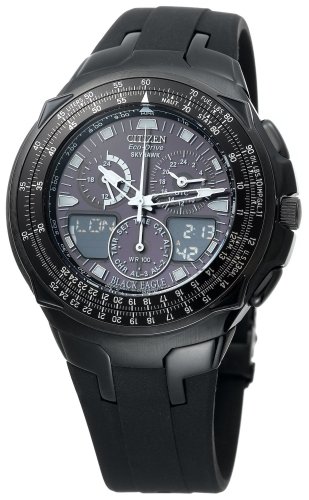 Sporting a hardened, special ops look, the Citizen Black Eagle Skyhawk stainless steel men's flight watch offers advanced timing functions and the latest technology. It's powered by Citizen's unique Eco-Drive, which absorbs sunlight and any artificial light through the crystal and dial to recharge the watch continuously. The fast-forward timekeeping features include time and calendar in twenty-two time zones, thirty cities, three world time alarms, a 99-minute countdown timer, one-touch interchangeable analog/digital time, and 1/100-second chronograph that measures up to 24 hours.